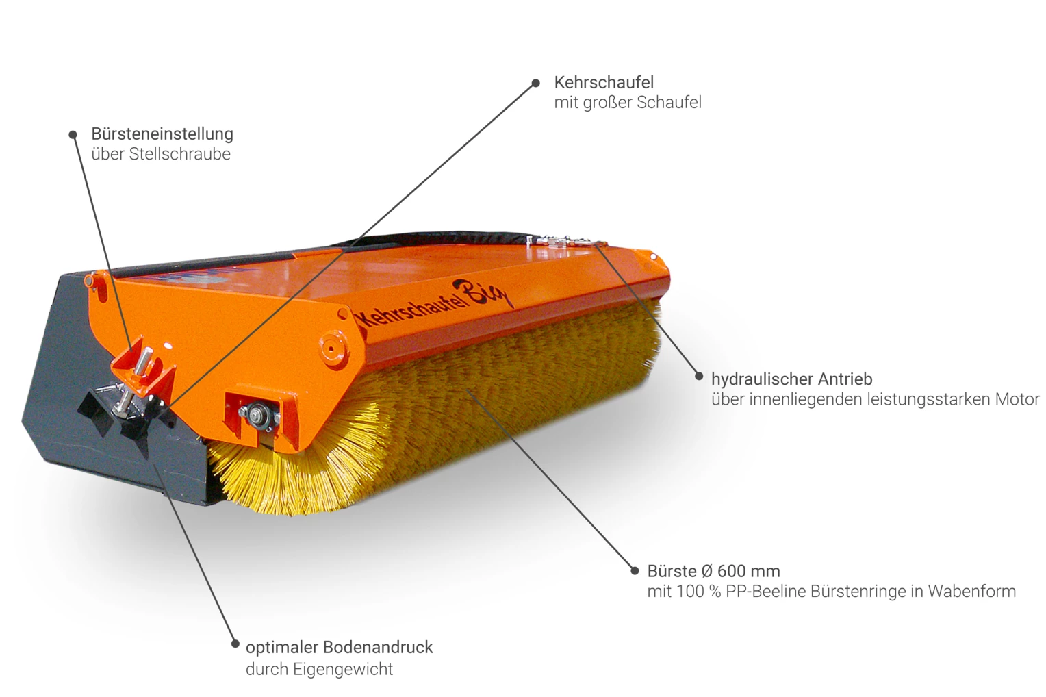 - Seitenkehrbesen hydraulisch angetrieben Ø 600 mm für randnahes Kehren (ggf. mit Wassersprüheinrichtung)