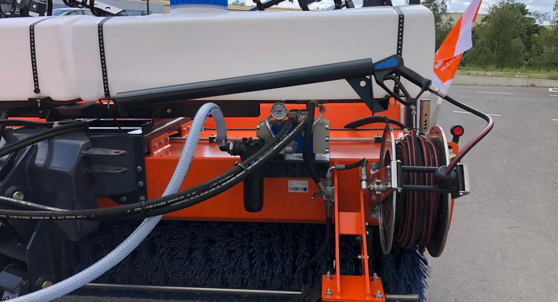 - Seitenkehrbesen hydraulisch angetrieben Ø 750 mm für randnahes Kehren (ggf. mit Wassersprüheinrichtung)