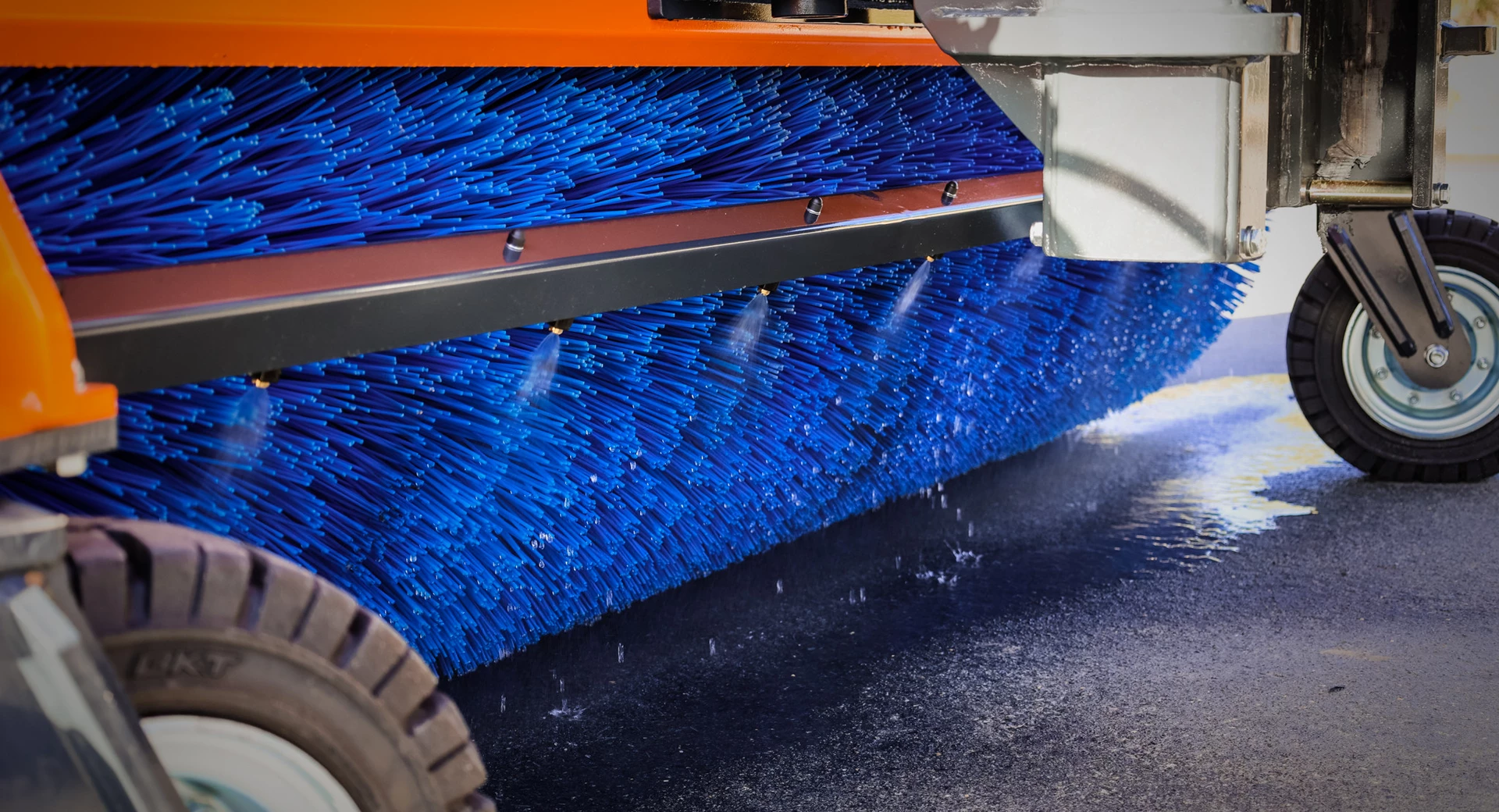 Die Seitenverstellung ist mechanisch und der Antrieb erfolgt über zwei innenliegende leistungsstarke Hydraulikmotoren. Die Bürstenringe aus 100 % PP in Wabenform mit einem Bürstendurchmesser von 920 mm werden über das bewährte TUCHEL-Rasthebelsystem für eine gleichmäßige Abnutzung in der Höhe verstellt.