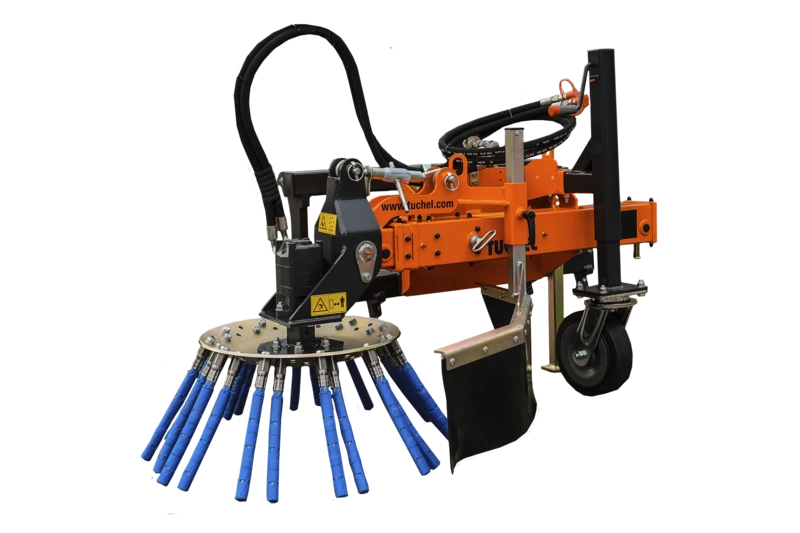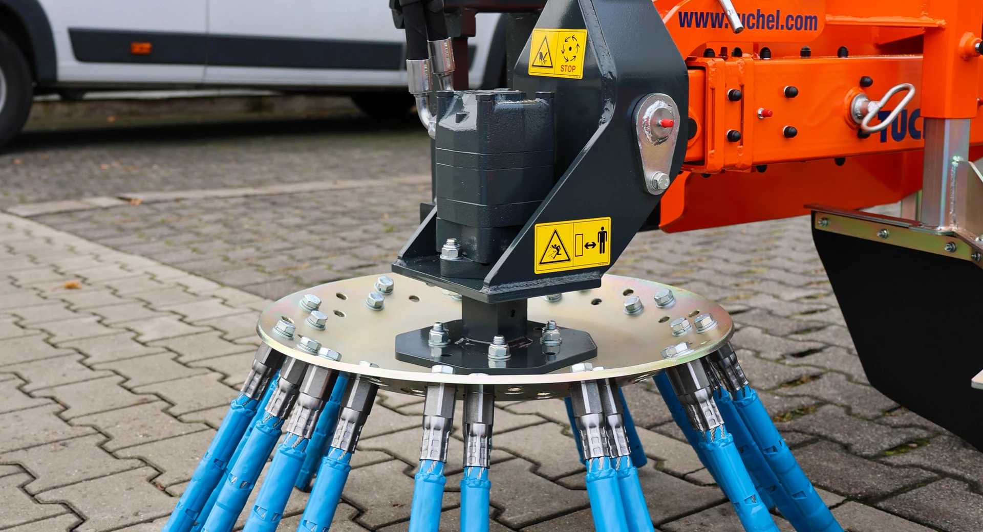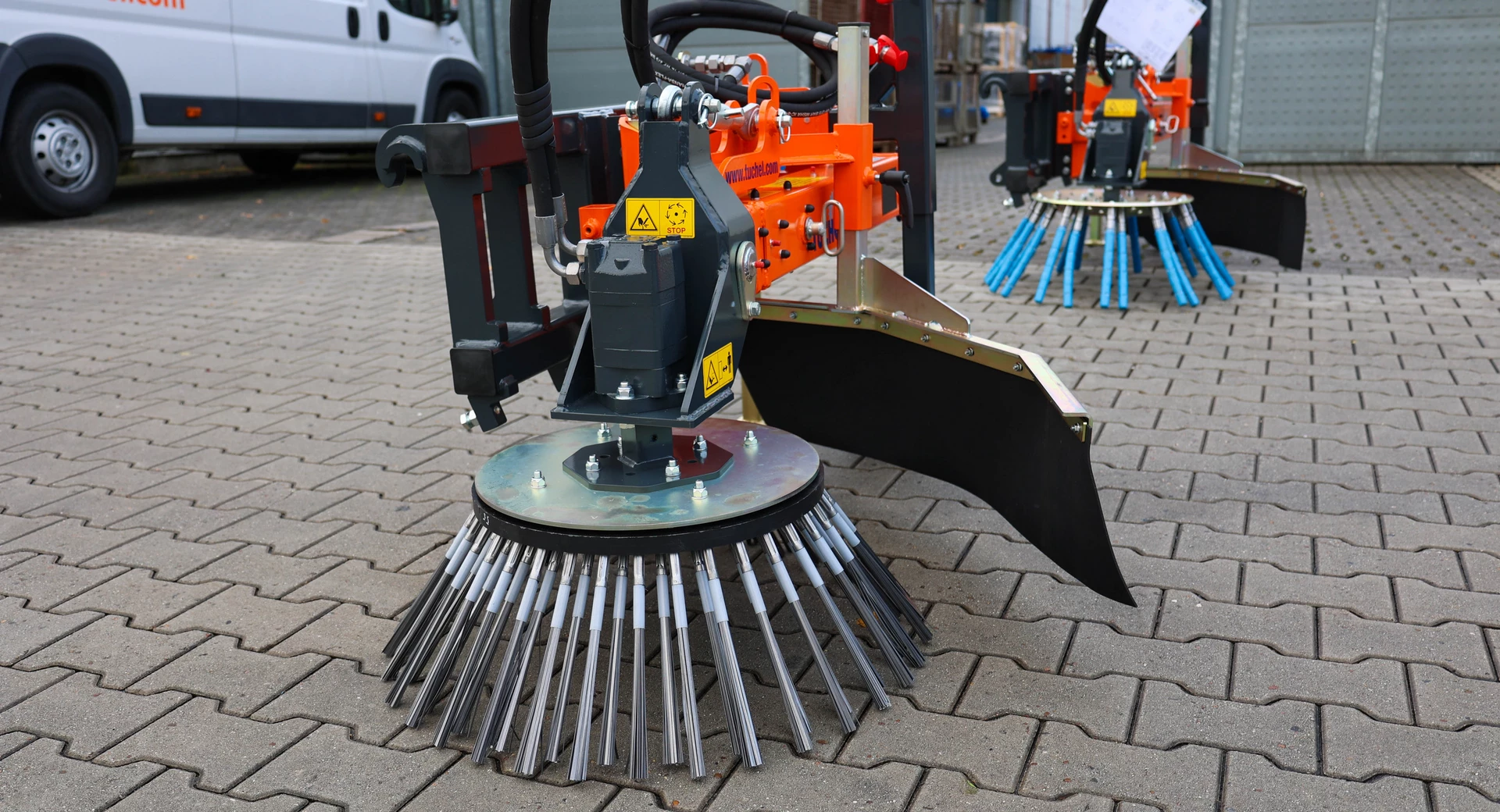 Die mechanische Seitenverschiebung ermöglicht auch das Entfernen im Randbereich und durch die mechanische Neigungsverstellung am Oberlenker wird ein höchstmöglicher Kratzeffekt erzielt. Der Tellerbesen hat einen Durchmesser von 750 mm, ist mit gebündeltem Flachstahldraht ausgestattet und wird hydraulisch angetrieben.