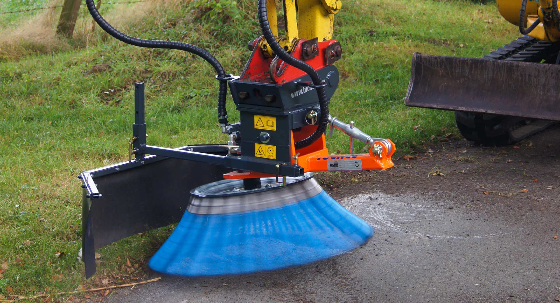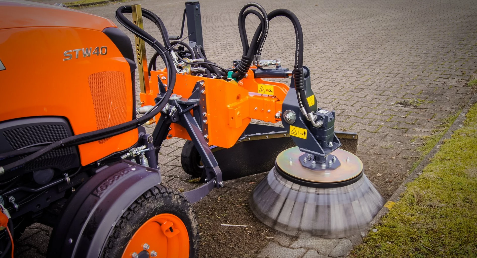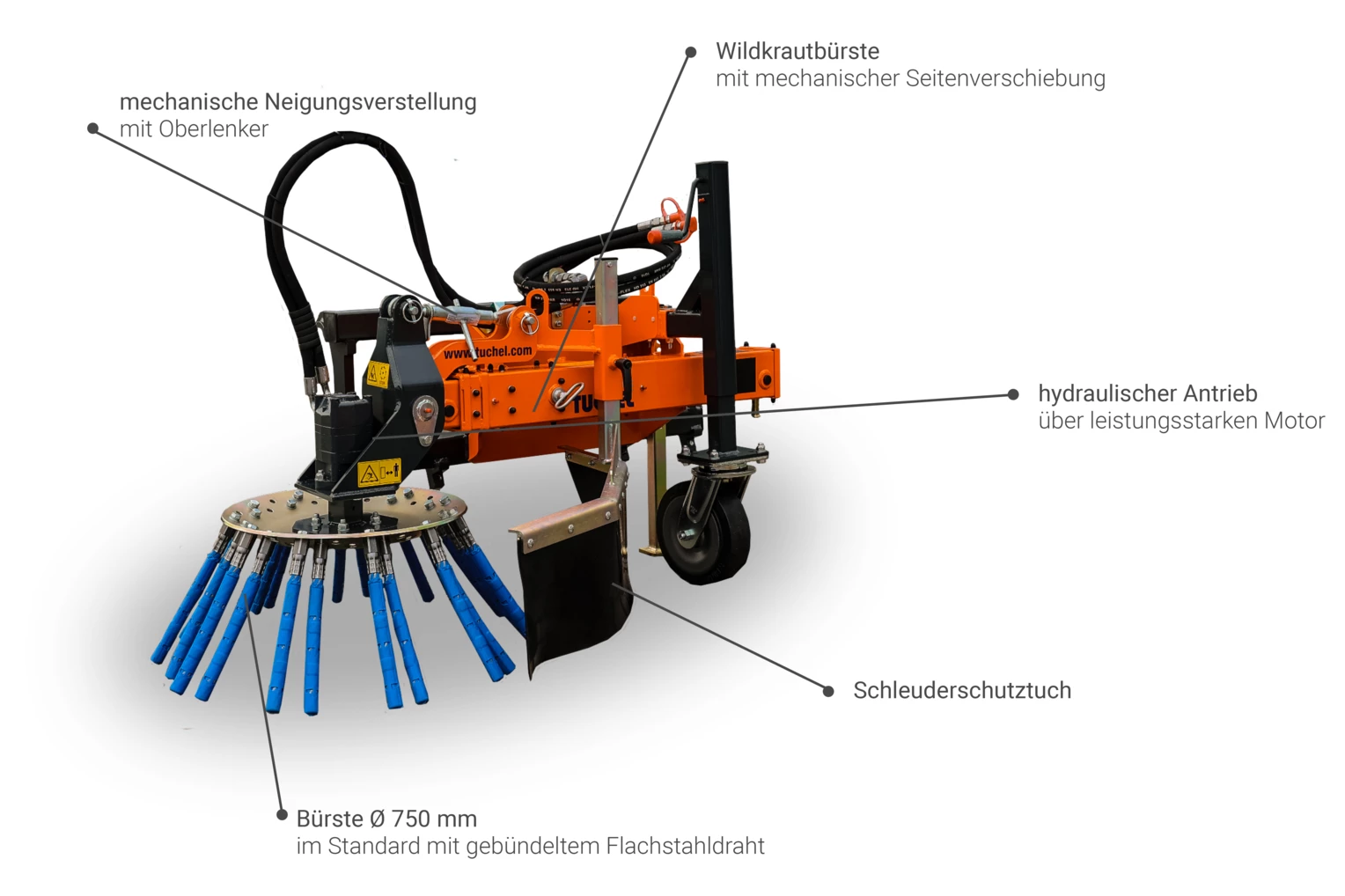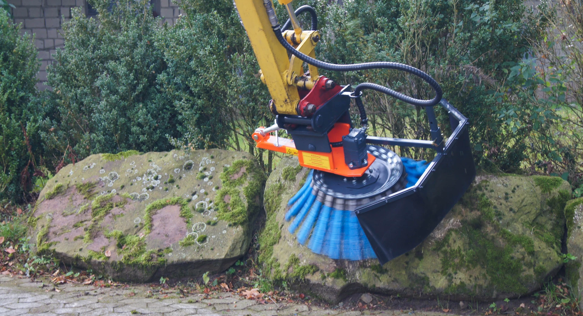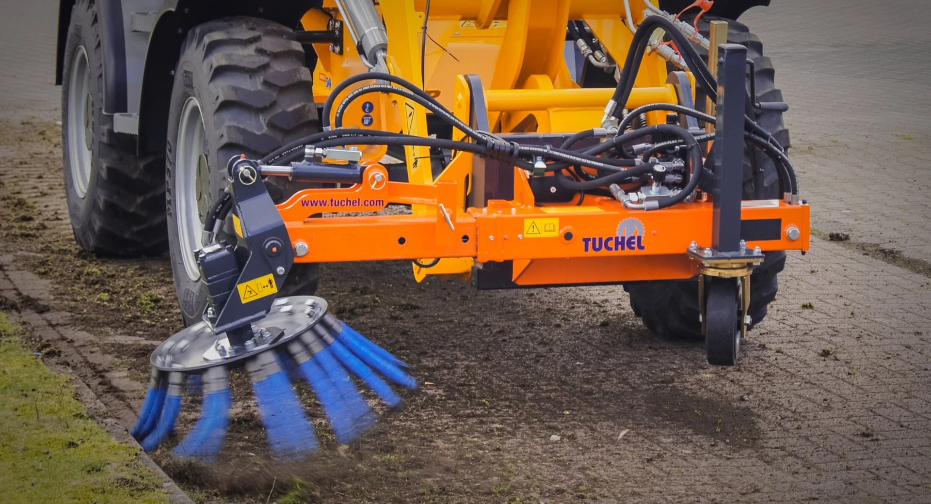 Die Wildkrautbürste WB 750 entfernt mühelos und chemiefrei jegliche Art von Wildkräutern und kann an Radladern, Traktoren, Kommunalfahrzeugen und Baggern angebaut werden