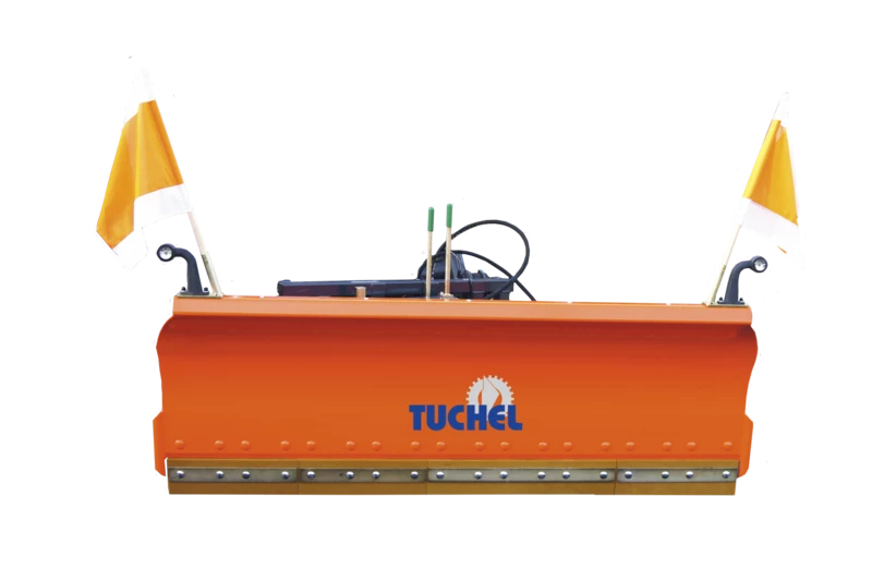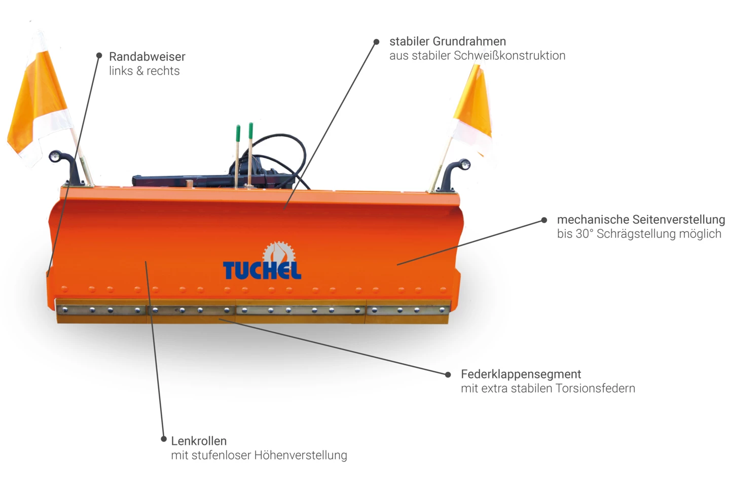 Der stabile Grundrahmen ist mit vereisungsfreien Federklappensegmenten ausgestattet. Wahlweise können die Segmente mit einer verwindungssteifen PU-Leiste, einer hochabriebsfesten Kommunalschürfleiste oder einem Stahlbesatz bestückt werden. Die Abkantungen im seitlichen und oberen Schildbereich sorgen für eine hohe Stabilität. Die mechanische Seitenverstellung ermöglicht ein seitliches Räumen.