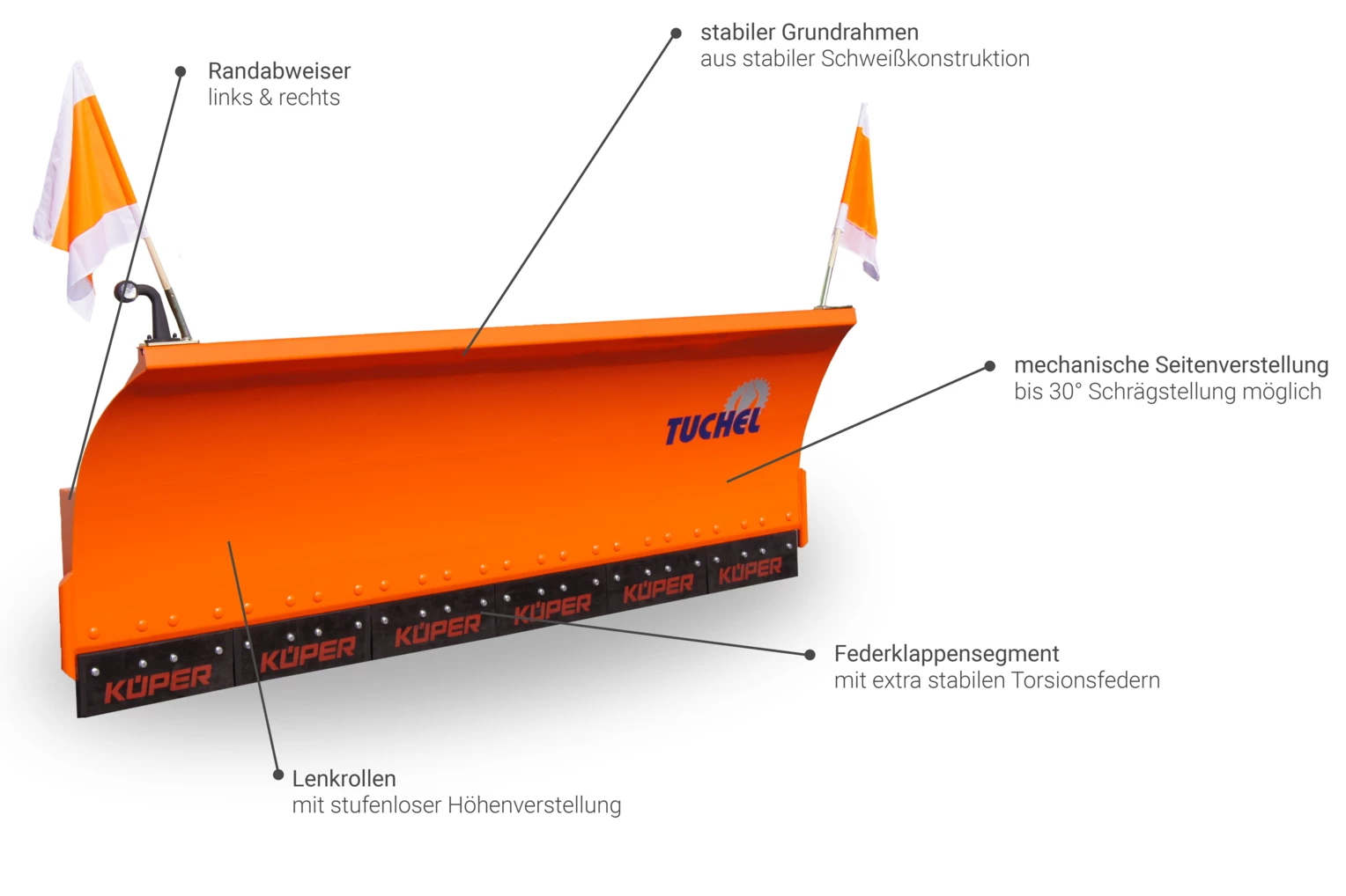 Der stabile Grundrahmen ist mit vereisungsfreien Federklappensegmenten ausgestattet. Wahlweise können die Segmente mit einer verwindungssteifen PU-Leiste, einer hochabriebsfesten Kommunalschürfleiste oder einem Stahlbesatz bestückt werden. Die Abkantungen im seitlichen und oberen Schildbereich sorgen für eine hohe Stabilität. Die mechanische Seitenverstellung ermöglicht ein seitliches Räumen.
