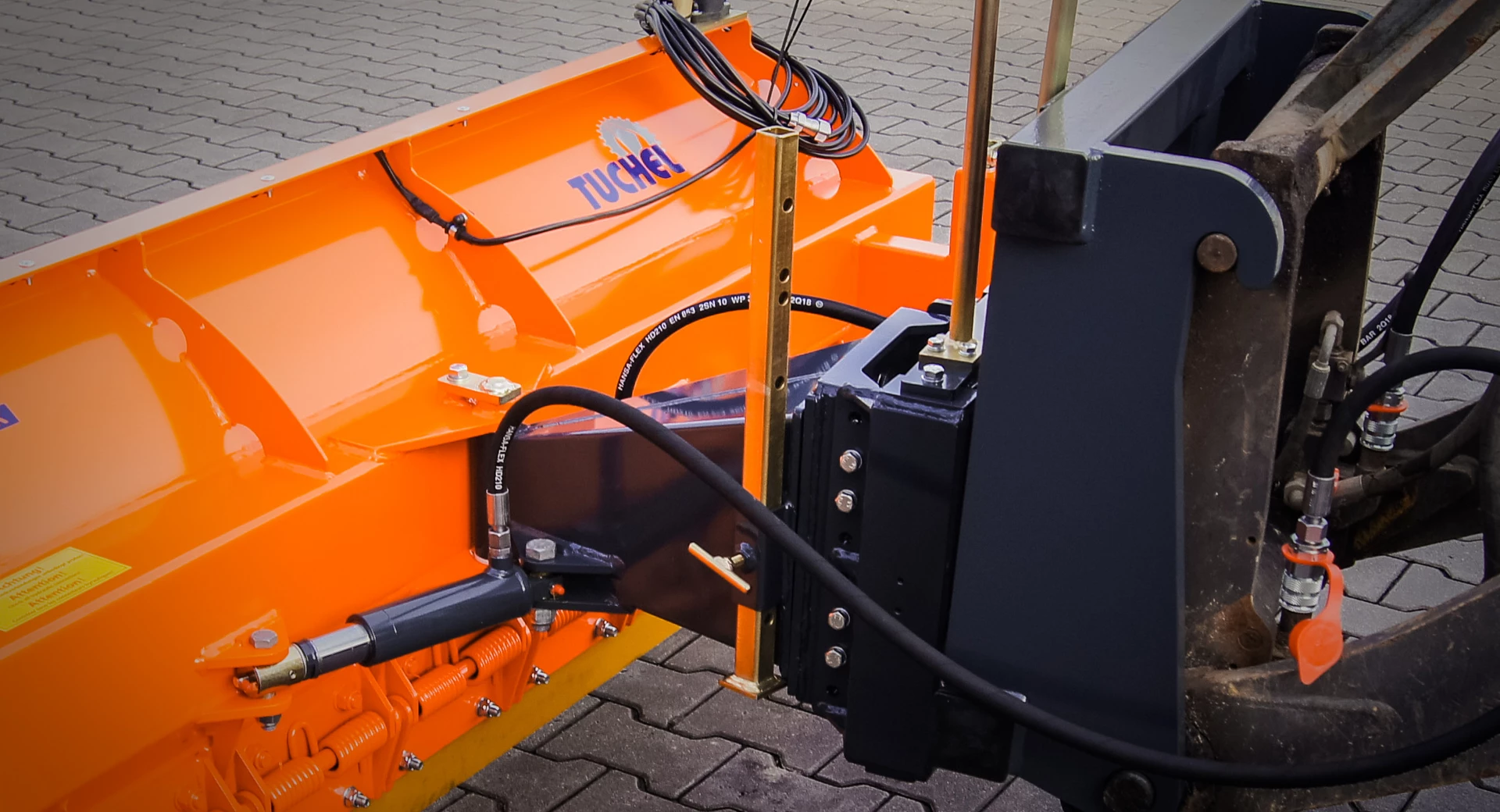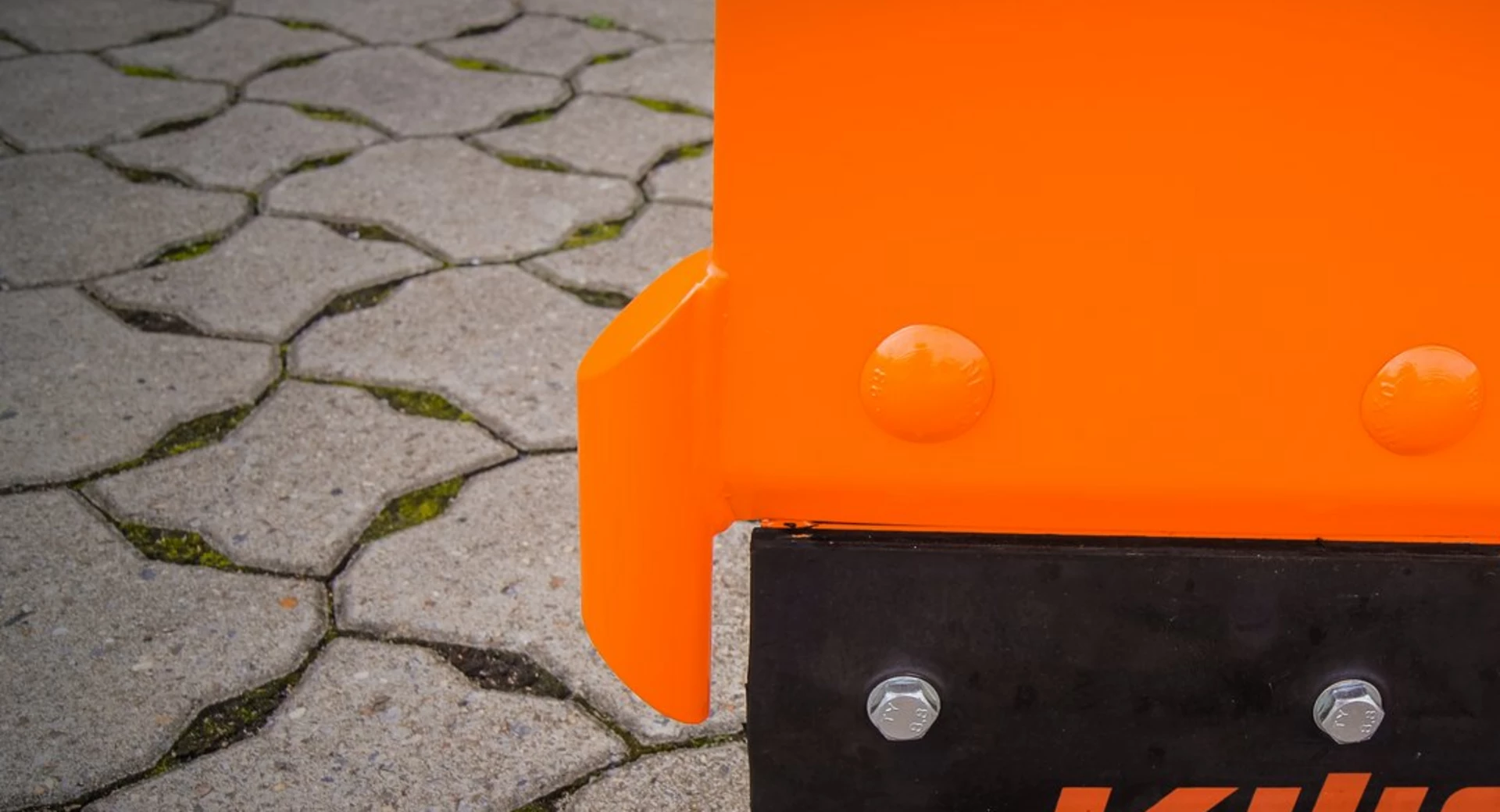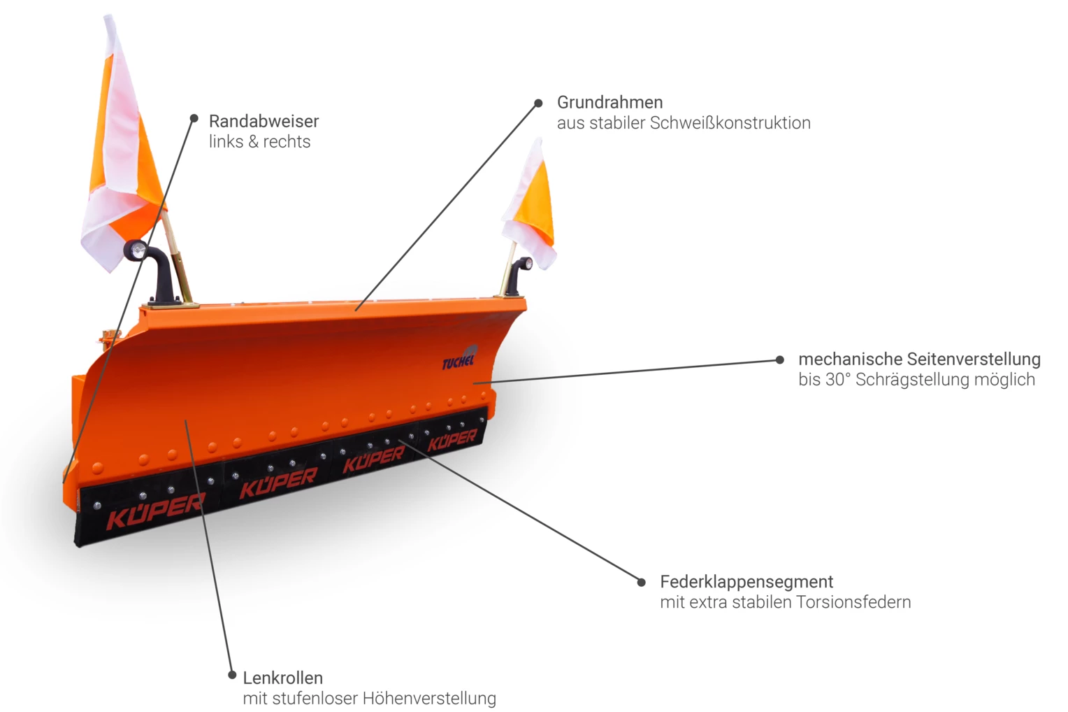 Der stabile Grundrahmen ist mit vereisungsfreien Federklappensegmenten ausgestattet. Wahlweise können die Segmente mit einer verwindungssteifen PU-Leiste, einer hochabriebsfesten Kommunalschürfleiste oder einem Stahlbesatz bestückt werden. Die Abkantungen im seitlichen und oberen Schildbereich sorgen für eine hohe Stabilität. Die mechanische Seitenverstellung ermöglicht ein seitliches Räumen.