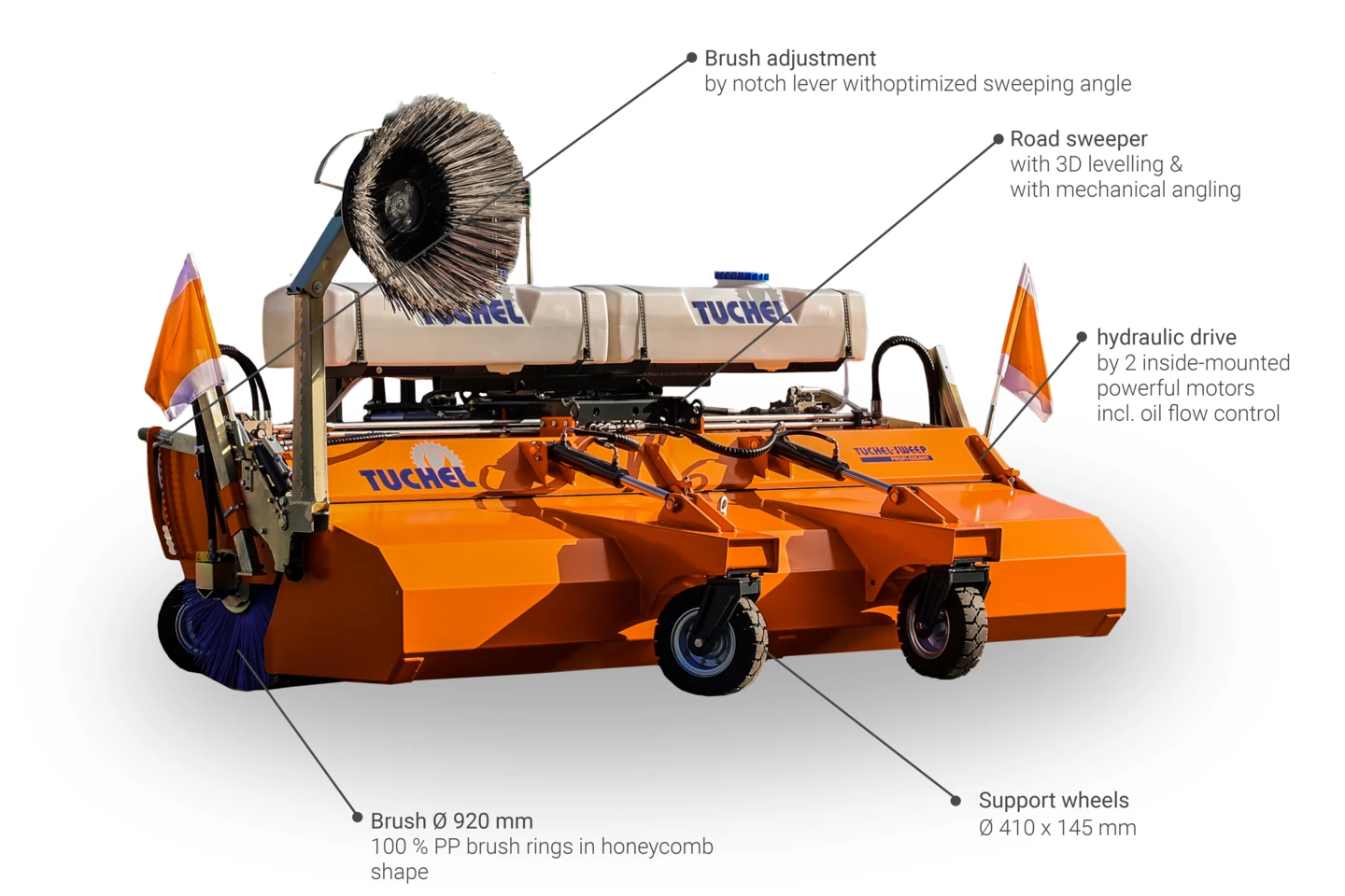 The mechanical angling is driven by two inside-mounted powerful hydraulic motors. The 100 % PP brush rings in honey comb shape of brush diameter of 920 mm are height-adjusted through the proven TUCHEL notch lever system to ensure even wear.