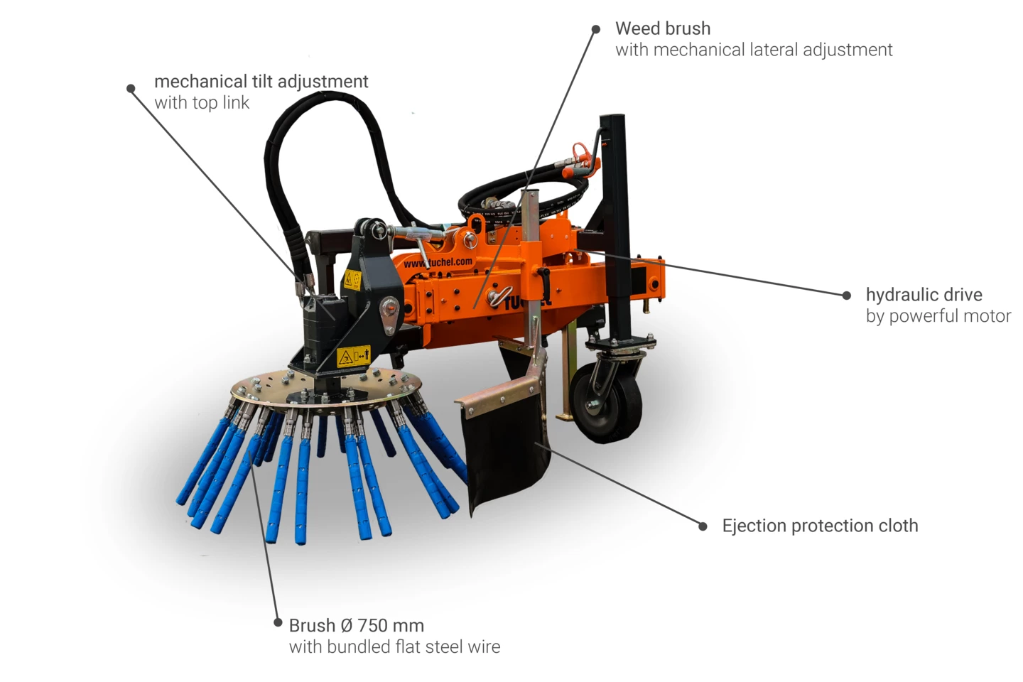 The 750 weed brush removes all kinds of weeds effort- lessly as well as without use of any chemicals and can be mounted on wheel loaders, tractors, municipal vehicles and excavators.