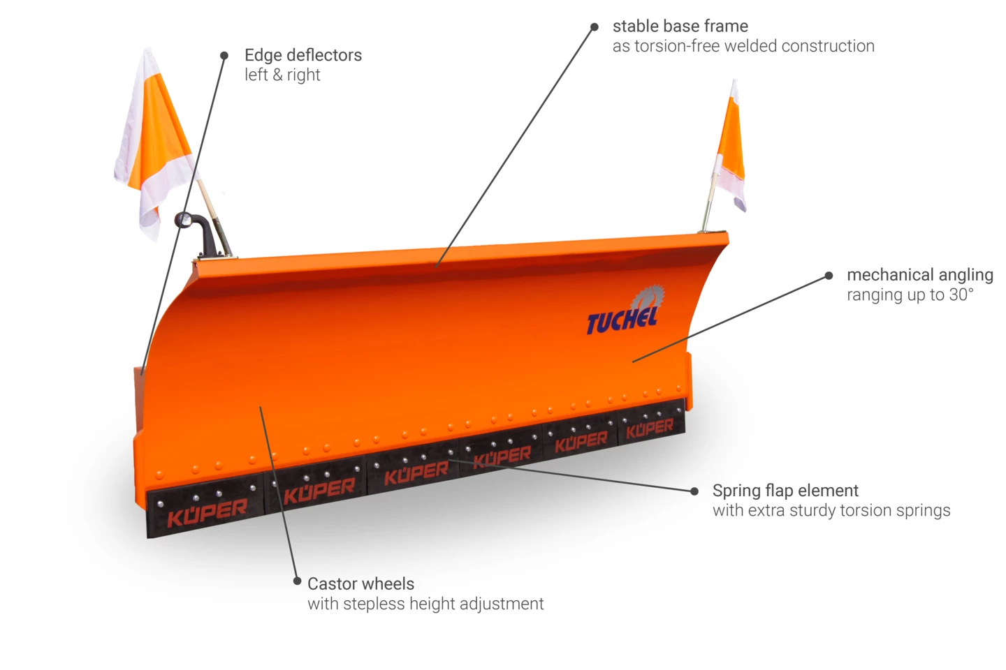 The sturdy base frame is equipped with non-icing spring flap segments and is optionally available with torsion-resistant PU-lip, steel trim or a highly abrasion-resistant municipal scraper bar. The bevels in the side and upper shield areas ensure a high degree of stability and the mechanical angling enables lateral clearing.