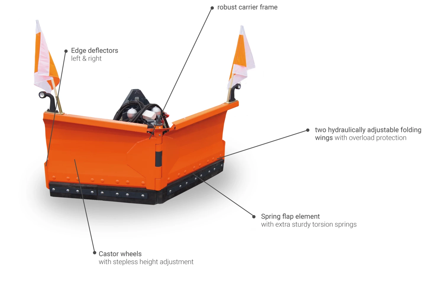 The robust carrier frame with two hydraulically adjustable folding wings can be used separately in V, Y or straight position. The non-icing spring flap segments serve as overrun protection with overload protection via a nitrogen accumulator.