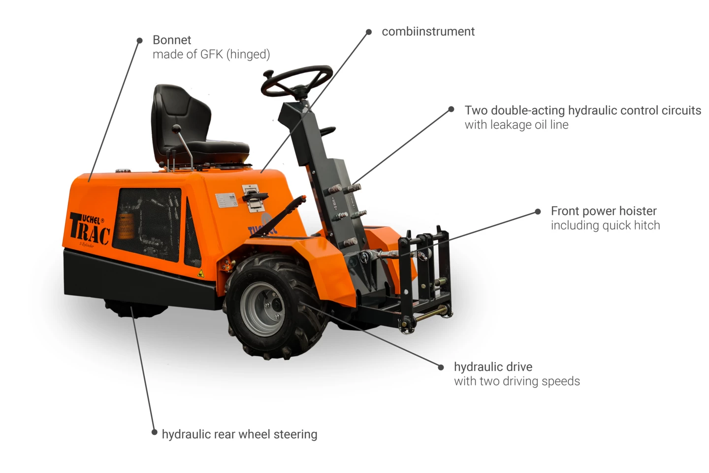 The Tuchel-Trac Trio is the appropriate carrier vehicle for minimising heavy physical work in agriculture, landscaping, municipalities or in the construction industry. Due to the compact design you have everything in view from the driver's seat and short distances when changing tools.