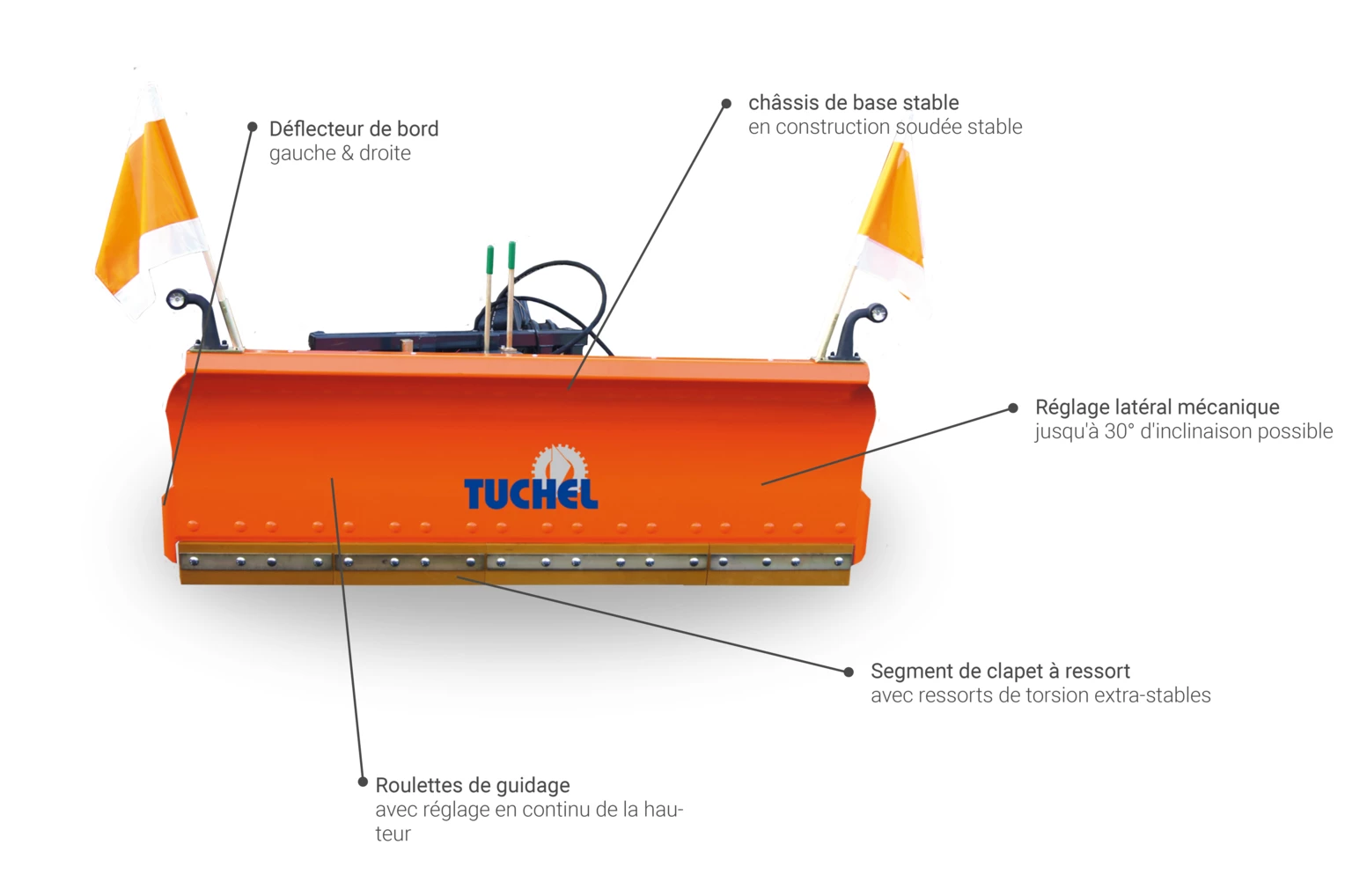 Le châssis de base robuste est équipé de segments de volets à ressort anti-givrage. Les segments peuvent être équipés au choix d'une bande en PU résistante à la torsion, d'une bande communale hautement résistante à l'abrasion ou d'un revêtement en acier. Les chants dans la zone latérale et supérieure de la lame garantissent une grande stabilité. Le réglage latéral mécanique permet un déneigement latéral.