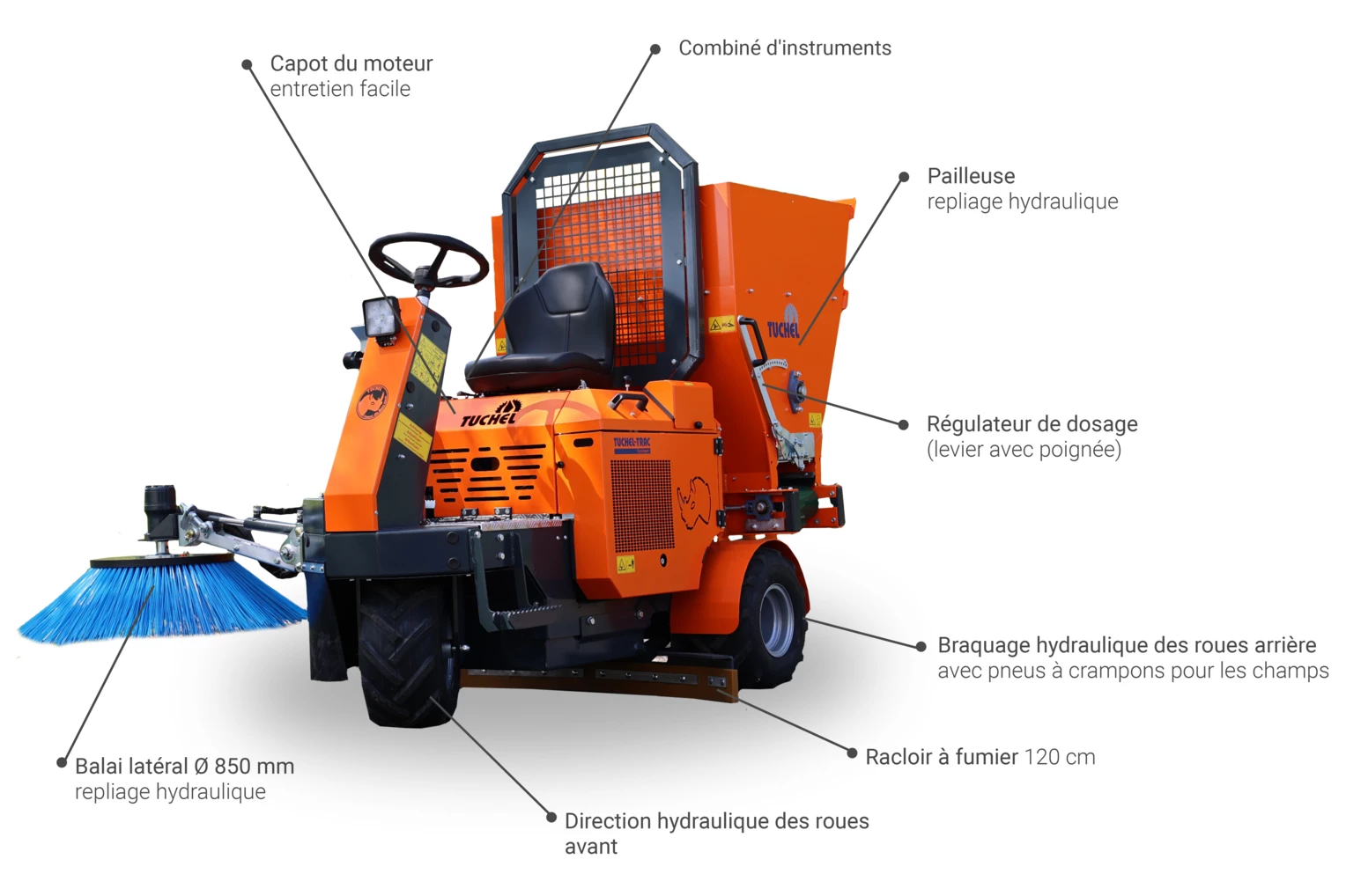 Le Tuchel-Trac FarmXpert : le véhicule 3 en 1 idéal pour les exploitations laitières, qui réduit les tâches manuelles lourdes et chronophages et soulage le personnel. Nettoyer les logettes, les pailler, nettoyer les fosses, le tout en une seule opération.